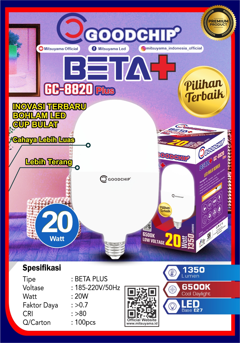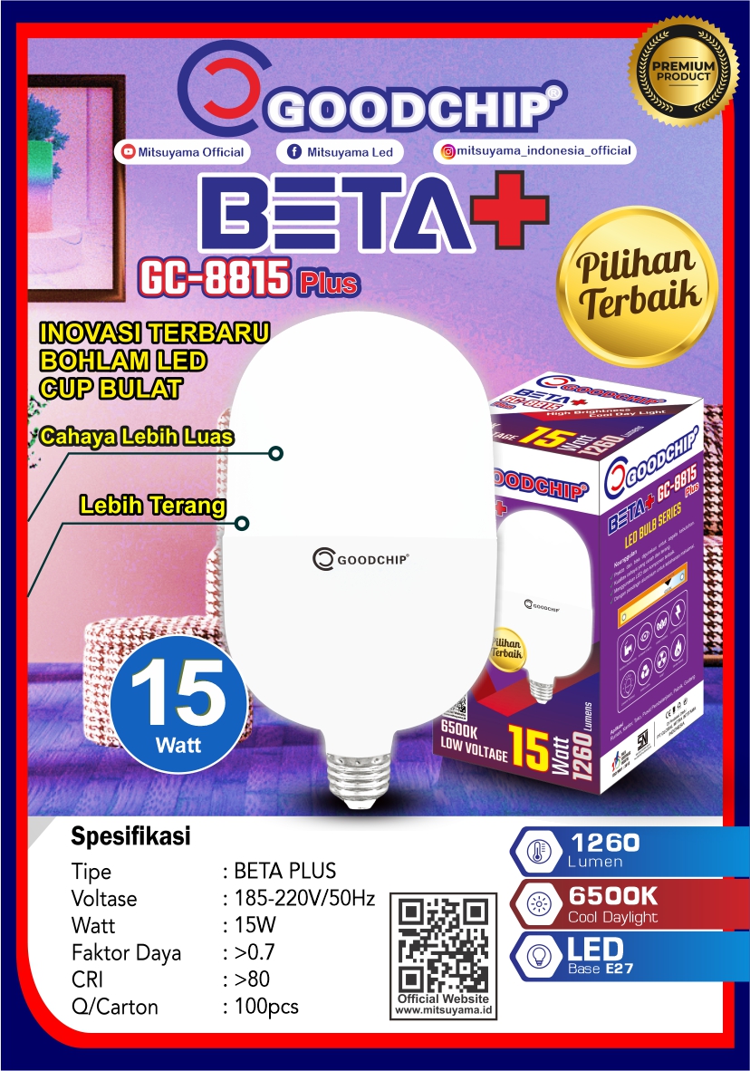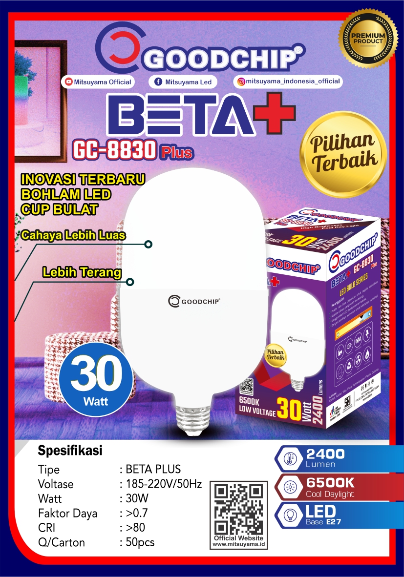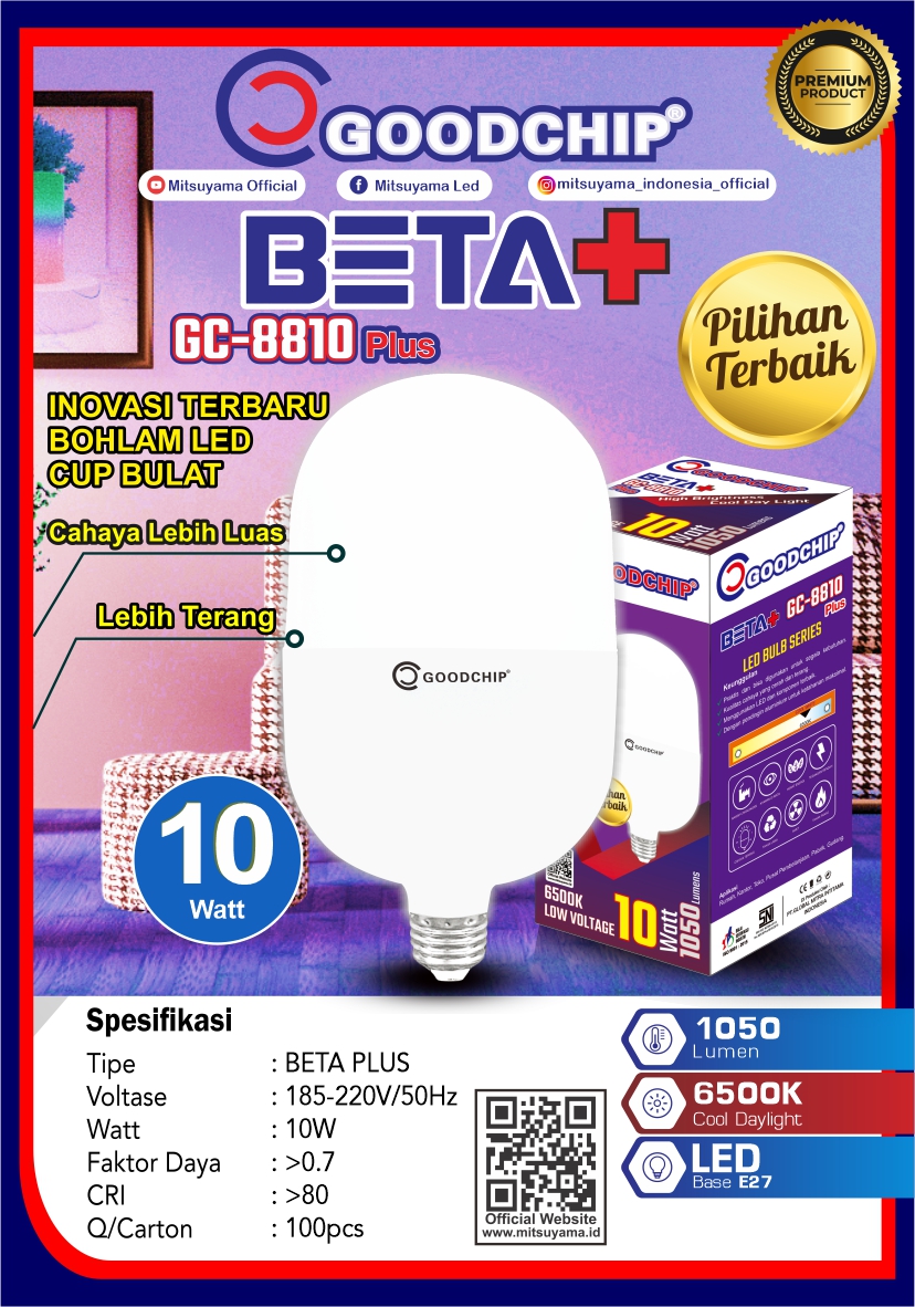 Lampu Bohlam Led Beta adalah lampu Led hemat daya dari Goodchip dengan harga terjangkau. Bisa menghemat 80% energi listrik di rumah anda. Selain itu lampu Led ini menggunakan pendingin sehingga cahaya yang dikeluarkan terang maksimal. Lampu Led ini cocok digunakan untuk keperluan toko, outlet pakaian, ruang tamu dan lain lain. Lampu ini juga mudah untuk urusan pemasangan karena menggunakan fitting standard E27.