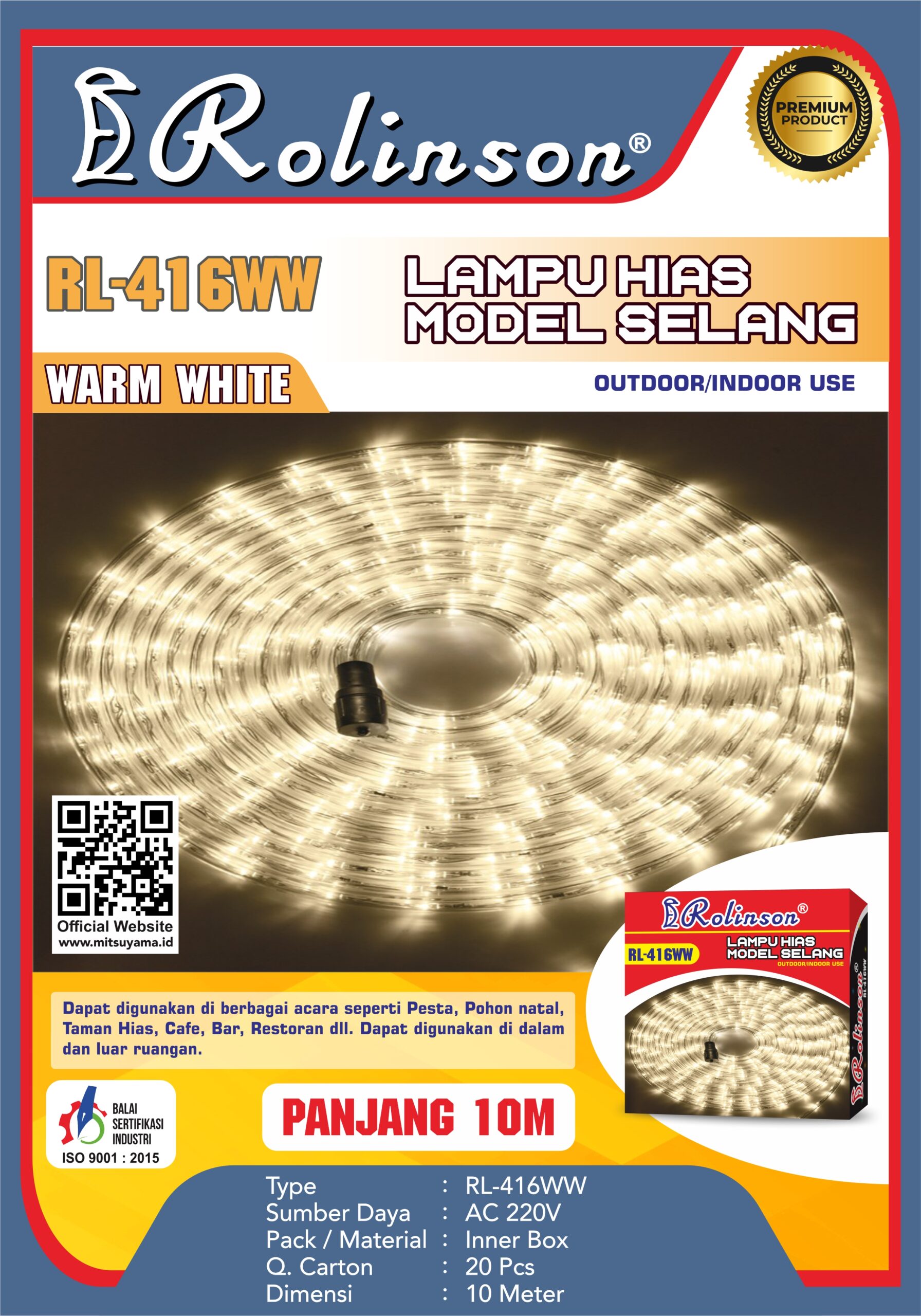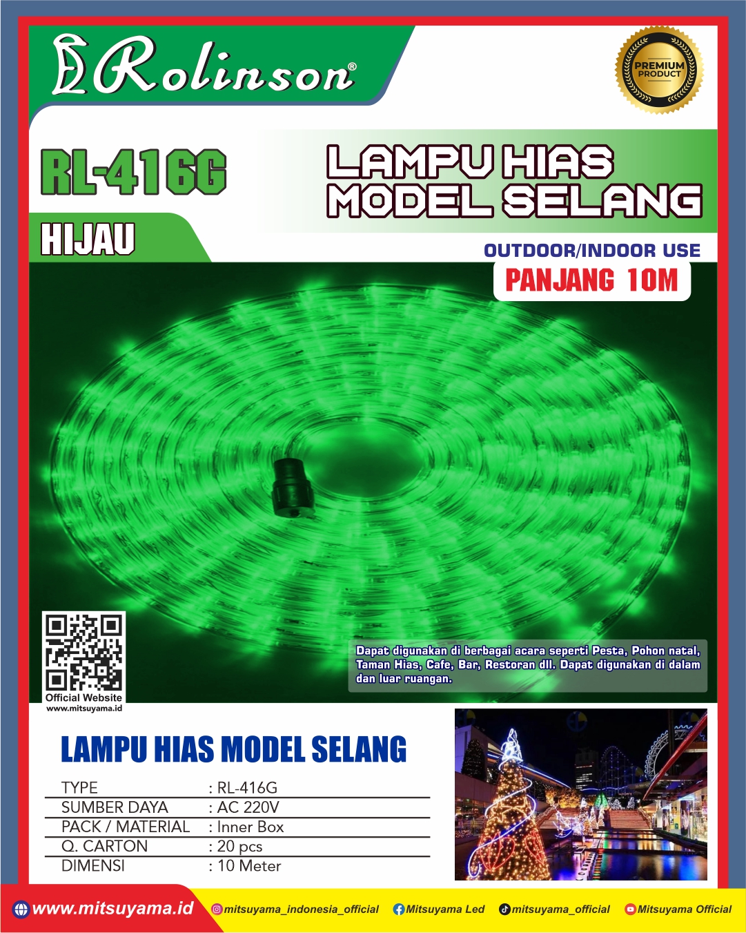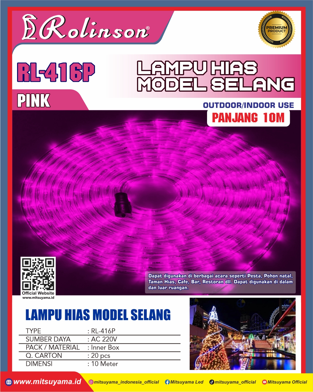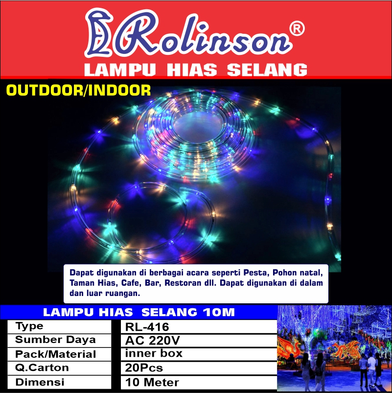Lampu Hias Selang Rolinson RL-416 dapat digunakan di berbagai acara seperti pesta,pohon natal,taman hias,cafe,bar,restoran dll.