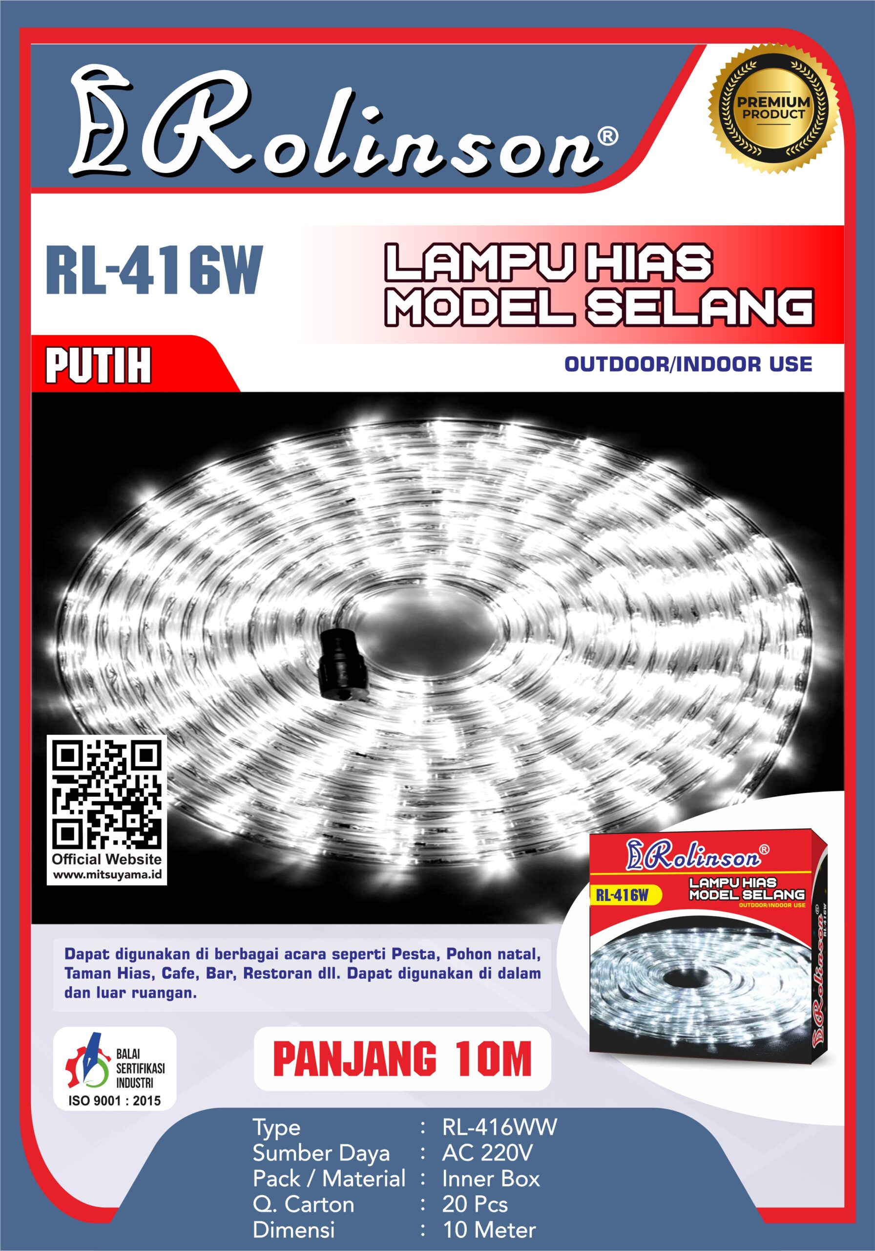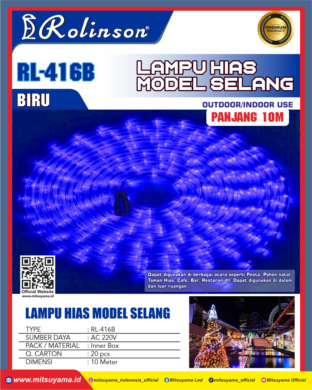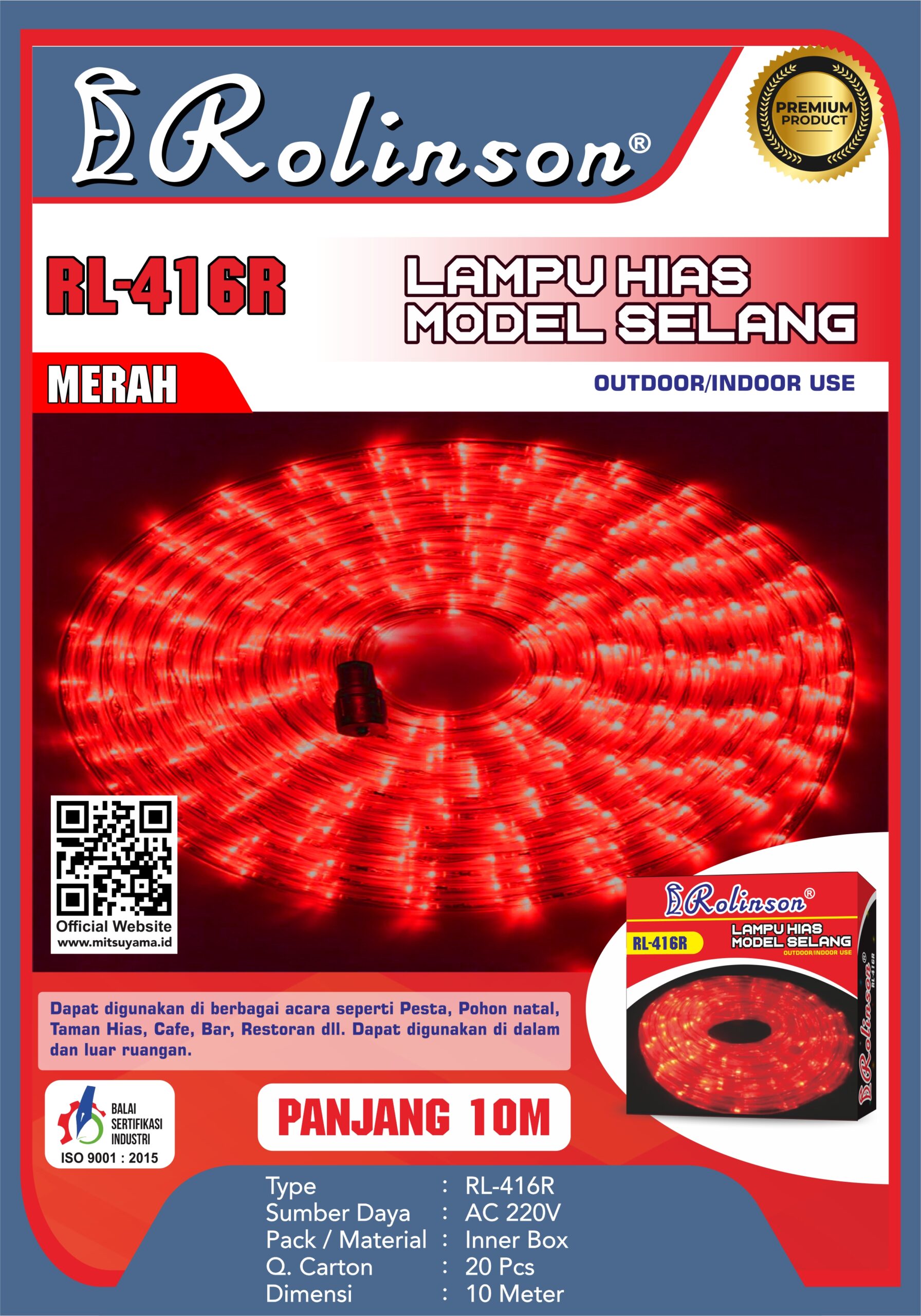 Lampu Hias Selang Rolinson RL-416 dapat digunakan di berbagai acara seperti pesta,pohon natal,taman hias,cafe,bar,restoran dll.